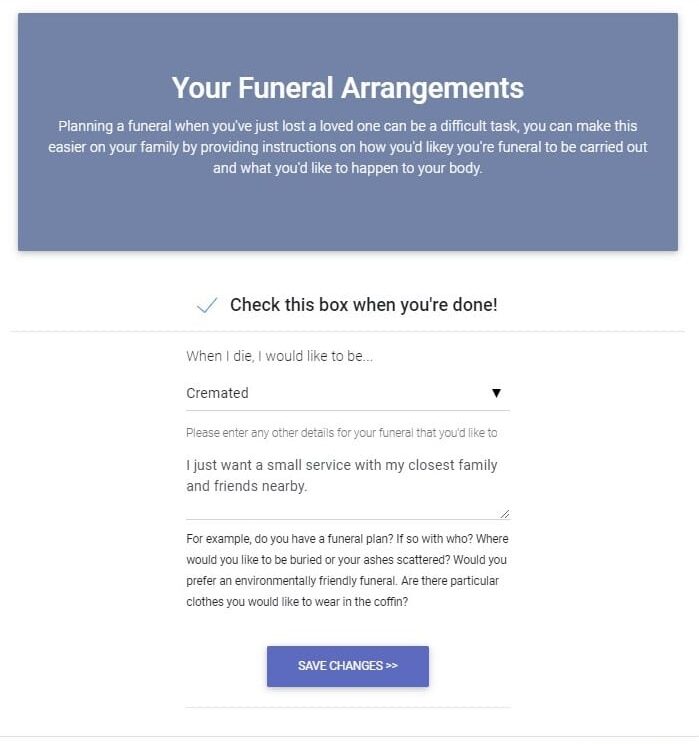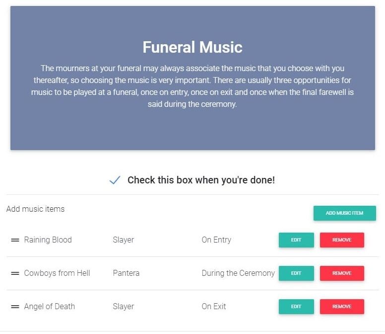 Inform your loved ones of your funeral wishes, music and eulogy